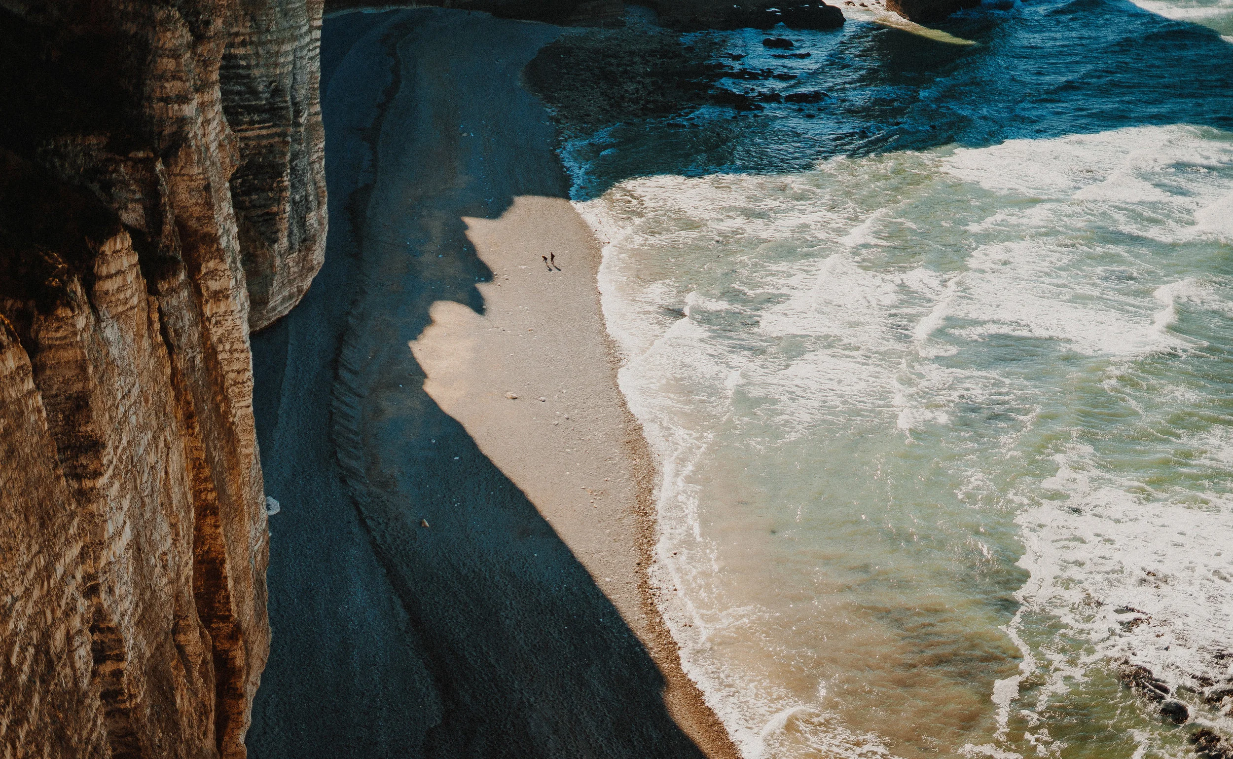 A large arch-shaped rock formation on the coast with waves crashing onto a sandy beach underneath, partially shaded by the cliffs.