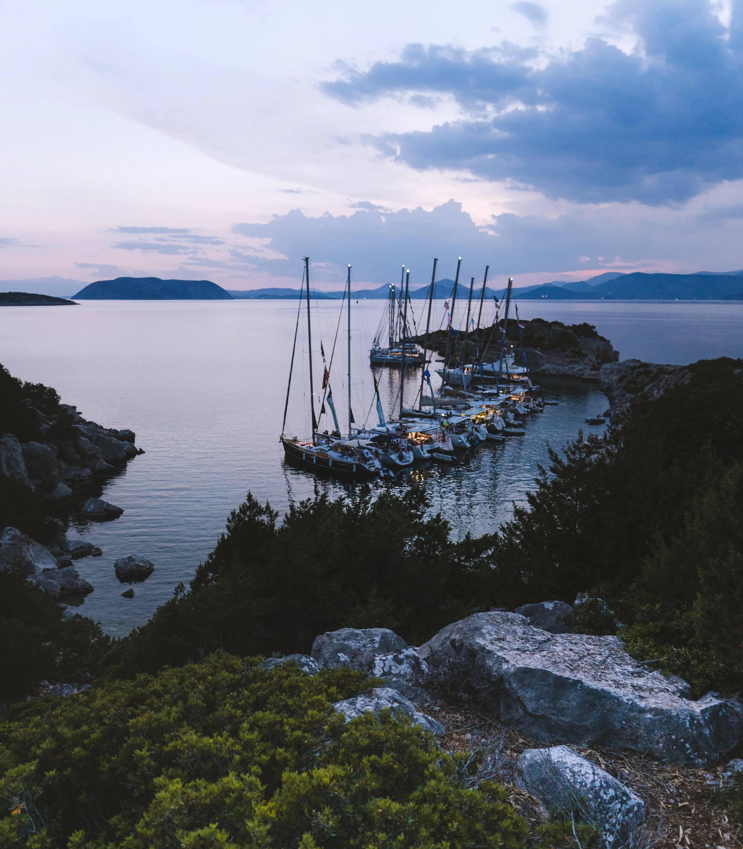 Sailboats docked in a calm bay at twilight with mountains in the distance, rocky shoreline, and lush green bushes in the foreground.