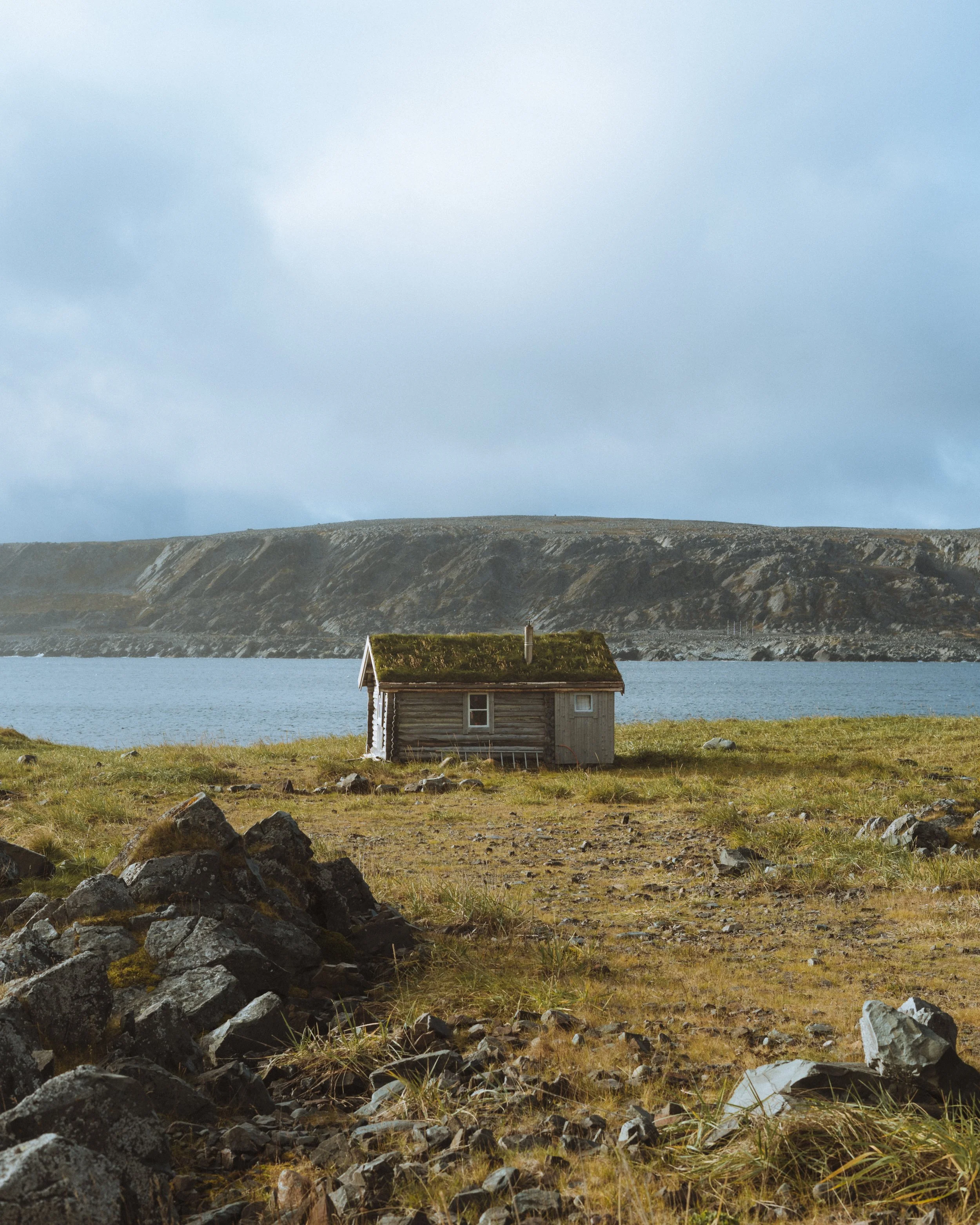 A serene lake surrounded by hills and rocky terrain, with pastel-colored sky at dusk. View fullsize